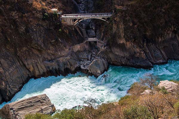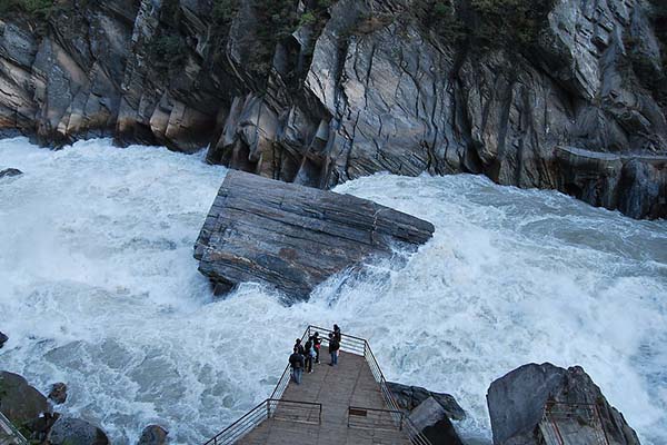 位于虎跳峡最末端,两侧绝壁耸立,江水倾斜而下如猛虎下山,水花飞溅犹如雷鸣,江边还有石板民居,别具风情。是欣赏虎跳峡壮观美景的绝佳地之一。